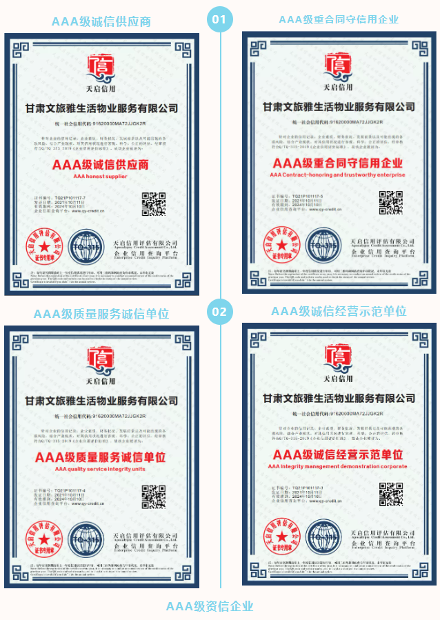 2021年,甘肅文旅雅生活物業服務有限公司認真貫徹落實習近平新時代中國特色社會主義思想,堅決落實集團公司各項決策部署。按照集團公司高質量發展要求,結合自身發展需要,公司于9月份正式啟動3A體系認證工作,經過權威認證機構對公司信用管理、制度建設、管理體系等方面綜合評估,10月底公司順利通過3A體系認證,使得公司在管理水平、制度建設方面有了進一步完善及提升,增強了公司核心競爭力和品牌影響力,為公司高質量發展奠定了堅實的基礎。
