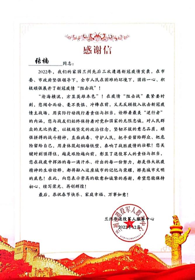 張楠同志是蘭州市政廣大疫情防控志愿者的一個縮影,這封感謝信是對蘭州市政不懼危險、逆向而行的志愿者們的嘉獎,更是對蘭州市政防疫貢獻的肯定。接下來,蘭州市政廣大黨員干部員工會繼續身體力行踐行二十大精神,不忘初心使命,積極承擔社會責任,彰顯國企員工硬核擔當。