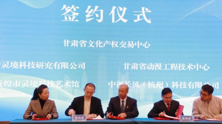 當天,甘肅文交中心與新靈境科技研究有限公司、中視長風(杭州)科技有限公司、甘肅省知識產權保護中心、甘肅云數字媒體版權保護中心等省內外八家單位簽署合作協議,攜手發展,合力推動全省數字賦能文化產業繁榮發展。