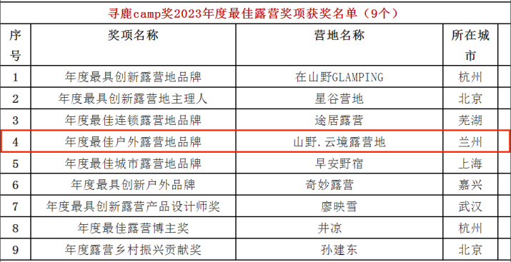 近日,中國旅游景區協會露營分會和中國車船協會房車露營分會指導支持的狐小旅首屆全國露營主理人大會暨2023“尋鹿CAMP”頒獎典禮在途居南通開沙島露營地舉行。甘肅文旅集團旗下石佛溝國家森林公園山野云境露營地榮獲“首屆尋鹿CAMP獎2023年度最佳戶外露營地品牌獎”獎項。
