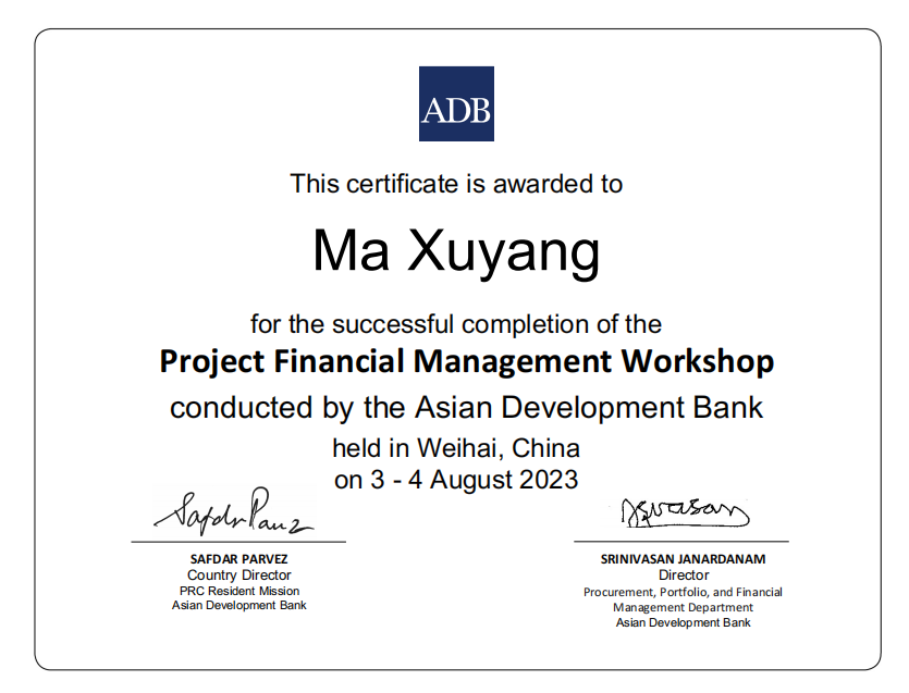 此次培訓重點對亞行采購政策、合同管理與合同計劃、亞行財務盡職分析要求、項目會計核算、項目財務報表、項目審計等主題進行授課。通過演講、案例研究、小組討論、結業測試及經驗豐富的執行機構分享經驗等方式使參訓人員加深了解亞行貸款采購、財務政策/規定并拓展實踐知識。甘肅文旅集團國際金融組織貸款項目管理辦公室一名同志代表亞行貸款甘肅環境可持續鄉村振興與發展項目作了大會交流發言,分享了項目管理工作中的經驗和關注點。培訓授課結束,三名參訓人員獲得了結業證書。
